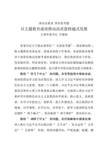 署名文章:20231213(主题教育 五道思考题)落实总要求 答好思考题 以主题教育成效推动高质量跨越式发展——大理市委书记 字德海