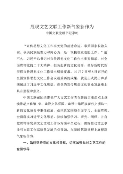 / 署名文章:20231130展现文艺文联工作新气象新作为——中国文联党组书记李屹