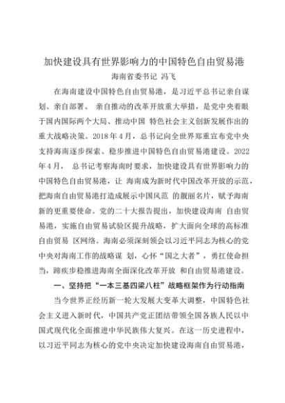 署名文章:20231130加快建设具有世界影响力的中国特色自由贸易港——海南省委书记 冯飞