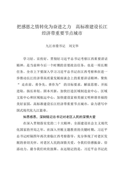 署名文章:20231106(习近平视察江西重要讲话)把感恩之情转化为奋进之力 高标准建设长江经济带重要节点城市——九江市委书记 刘文华