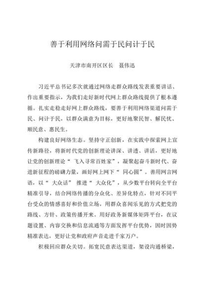 / 署名文章:20231106(群众工作)善于利用网络问需于民问计于民——天津市南开区区长 聂伟迅