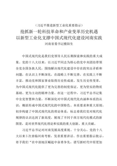 署名文章:20231030(习近平推进新型工业化重要指示)抢抓新一轮科技革命和产业变革历史机遇以新型工业化支撑中国式现代化建设河南实践——河南省委书记楼阳生