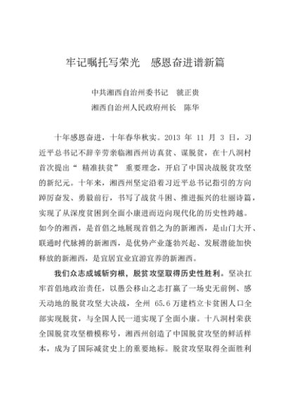 / 署名文章:20231103(脱贫攻坚)牢记嘱托写荣光 感恩奋进谱新篇——湘西书记 虢正贵 州长 陈华