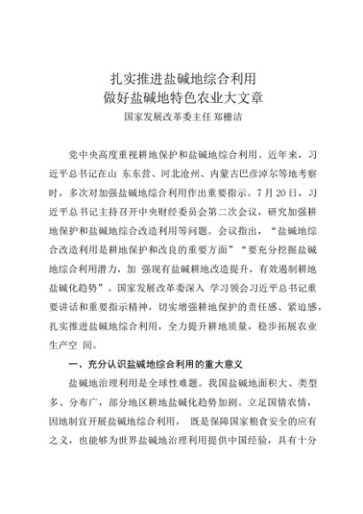 署名文章:20231030(习近平中央财经委员会第二次会议讲话)扎实推进盐碱地综合利用做好盐碱地特色农业大文章——国家发展改革委主任郑栅洁