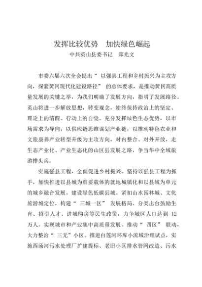 / 署名文章:20230919发挥比较优势 加快绿色崛起(强县工程、乡村振兴)——英山县委书记 郑光文