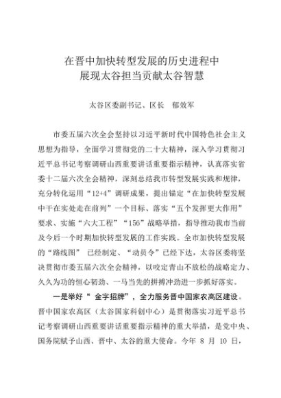 / 署名文章:20230914在晋中加快转型发展的历史进程中展现太谷担当贡献太谷智慧——区长 郁效军