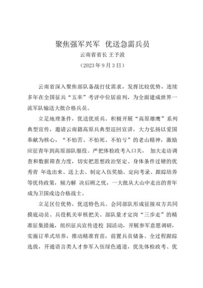 / 署名文章:20230903聚焦强军兴军优送急需兵员——云南省省长王予波