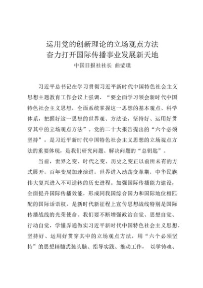 署名文章:20230830运用党的创新理论的立场观点方法奋力打开国际传播事业发展新天地——中国日报社社长 曲莹璞