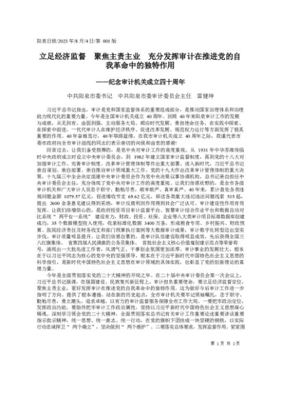 署名文章:20230804中共阳泉市委书记中共阳泉市委审计委员会主任雷健坤:立足经济监督聚焦主责主业充分发挥审计在推进党的自我革命中的独特作用