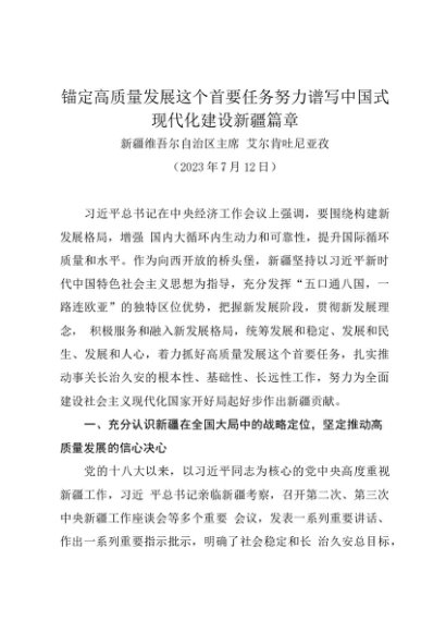 署名文章:20230712锚定高质量发展这个首要任务努力谱写中国式现代化建设新疆篇章——新疆主席 艾尔肯吐尼亚孜