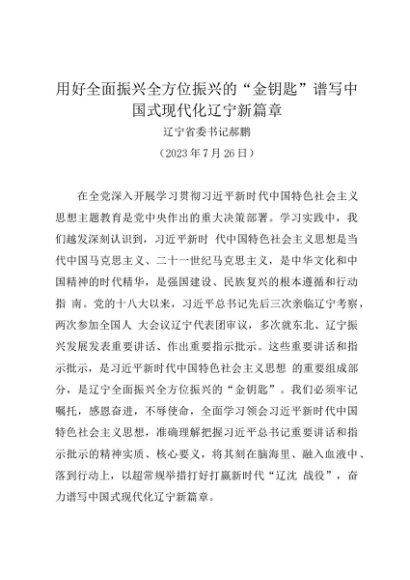 署名文章:20230726用好全面振兴全方位振兴的“金钥匙”谱写中国式现代化辽宁新篇章——辽宁省委书记郝鹏