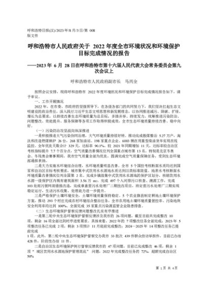 署名文章:20230803呼和浩特市人民政府副市长马丙全:呼和浩特市人民政府关于2022年度全市环境状况和环境保护目标完成情况的报告