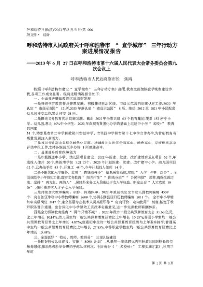/ 署名文章:20230803呼和浩特市人民政府副市长焦鸿:呼和浩特市人民政府关于呼和浩特市宜学城市三年行动方案进展情况报告