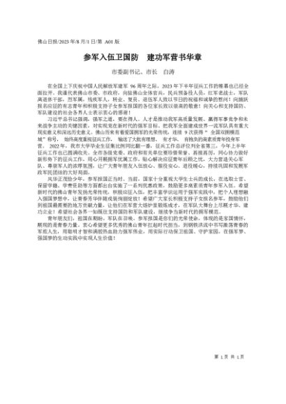 / 署名文章:20230801市委副书记、市长白涛:参军入伍卫国防建功军营书华章