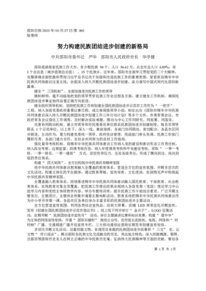 署名文章:2023.10.27中共邵阳市委书记严华邵阳市人民政府市长华学健:努力构建民族团结进步创建的新格局