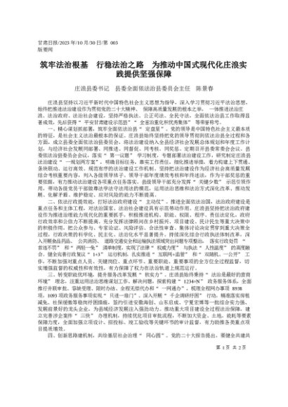 / 署名文章:2023.10.30庄浪县委书记陈景春:筑牢法治根基行稳法治之路为推动中国式现代化庄浪实践提供坚强保障