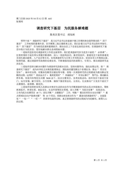 / 署名文章:2023.10.12集美区委书记胡旭彬:调查研究下基层为民服务解难题
