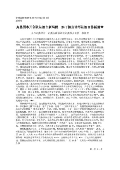 署名文章:2023.10.20合作市委书记市委全面依法治市委员会主任李新平:夯基固本开创依法治市新局面实干担当谱写法治合作新篇章