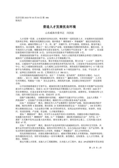 署名文章:2023.10.10山东威海市委书记闫剑波:营造人才发展优良环境