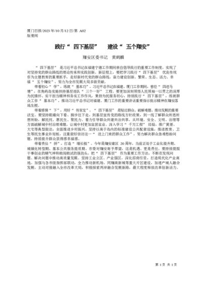 / 署名文章:2023.10.12翔安区委书记黄鹤麟:践行四下基层建设五个翔安