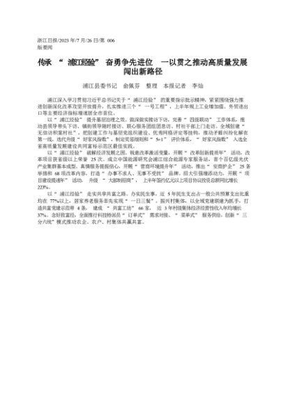 / 署名文章:2023.07.26浦江县委书记俞佩芬:传承浦江经验奋勇争先进位一以贯之推动高质量发展闯出新路径