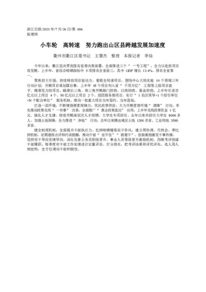署名文章:2023.07.26衢州市衢江区委书记王慧杰:小车轮高转速努力跑出山区县跨越发展加速度