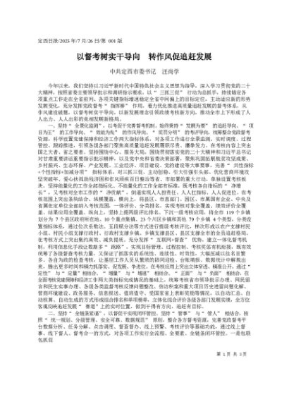 / 署名文章:2023.07.26中共定西市委书记汪尚学:以督考树实干导向转作风促追赶发展