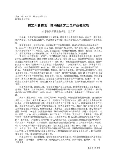 / 署名文章:2023.07.22山东临沂郯城县委书记王立军:树立大食物观推动粮食加工全产业链发展