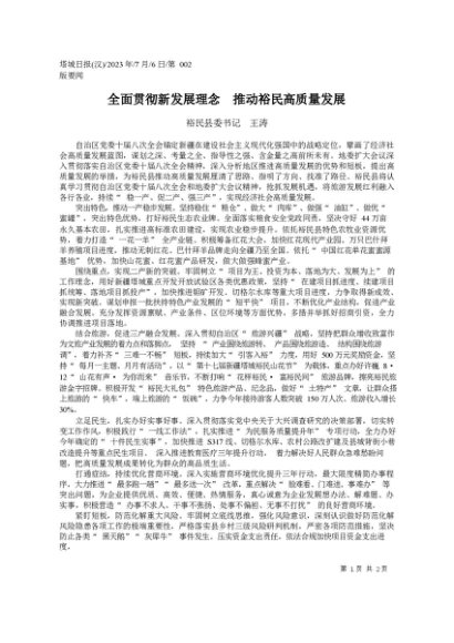 / 署名文章:2023.07.06裕民县委书记王涛:全面贯彻新发展理念推动裕民高质量发展