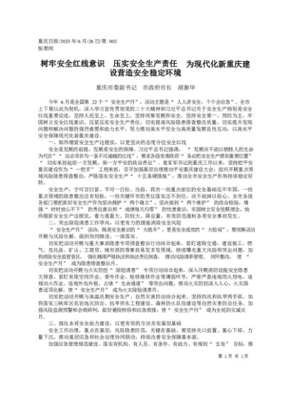 署名文章:2023.06.26重庆市委副书记市政府市长胡衡华:树牢安全红线意识压实安全生产责任为现代化新重庆建设营造安全稳定环境