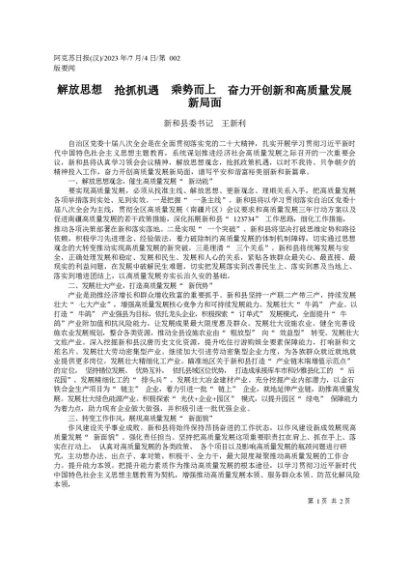 署名文章:2023.07.04新和县委书记王新利:解放思想抢抓机遇乘势而上奋力开创新和高质量发展新局面