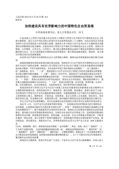 署名文章:2023.06.20中共海南省委书记、省人大常委会主任冯飞:加快建设具有世界影响力的中国特色自由贸易港
