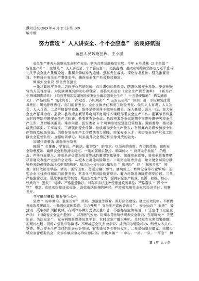 署名文章:2023.06.21范县人民政府县长王小鹏:努力营造人人讲安全、个个会应急的良好氛围