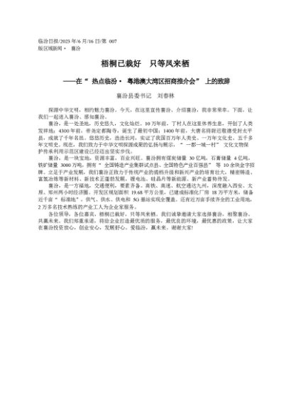 / 署名文章:2023.06.16襄汾县委书记刘春林:梧桐已栽好只等凤来栖
