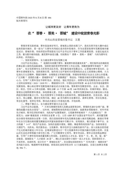 / 署名文章:2023.06.08中共山西省晋城市委书记王震:在晋善·晋美·晋城建设中绽放青春光彩