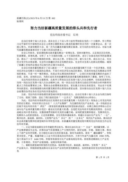 / 署名文章:2023.06.11克拉玛依市委书记石岗:努力当好新疆高质量发展的排头兵和先行者