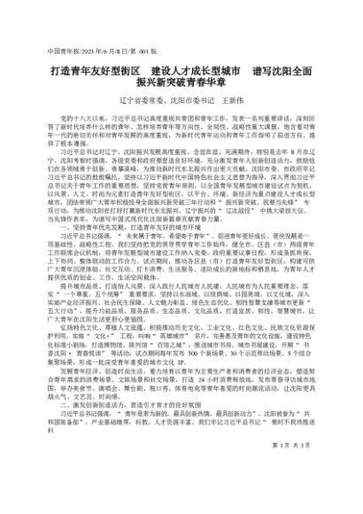 署名文章:2023.06.08辽宁省委常委、沈阳市委书记王新伟:打造青年友好型街区建设人才成长型城市谱写沈阳全面振兴新突破青春华章