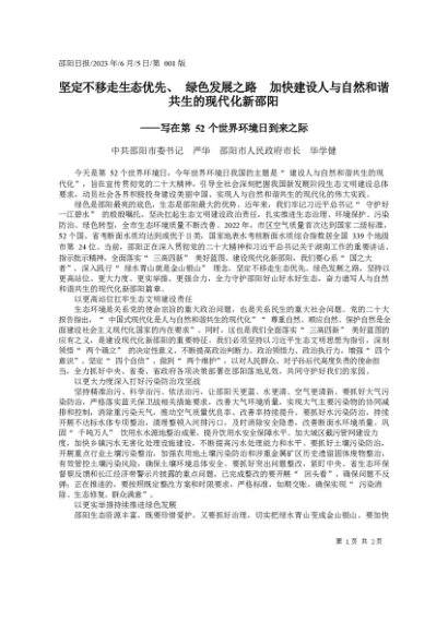 署名文章:2023.06.05中共邵阳市委书记严华邵阳市人民政府市长华学健:坚定不移走生态优先、绿色发展之路加快建设人与自然和谐共生的现代化新邵阳