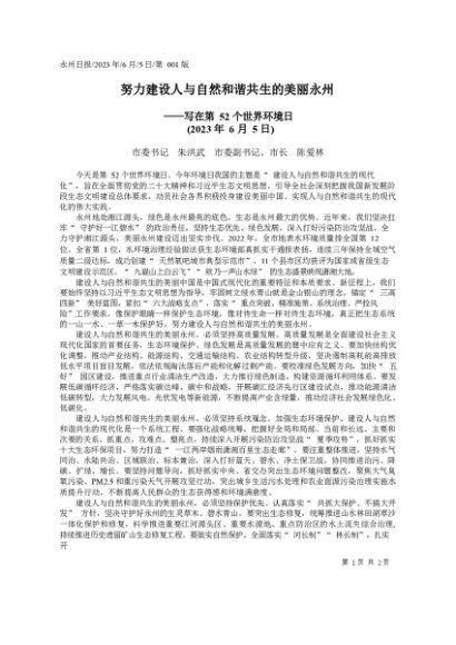 署名文章:2023.06.05市委书记朱洪武市委副书记、市长陈爱林:努力建设人与自然和谐共生的美丽永州