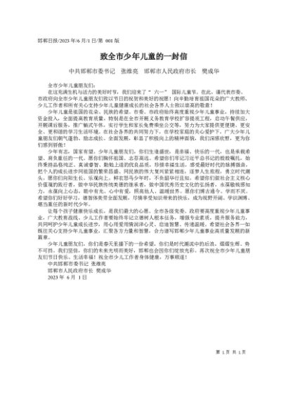 / 署名文章:2023.06.01中共邯郸市委书记张维亮邯郸市人民政府市长樊成华:致全市少年儿童的一封信