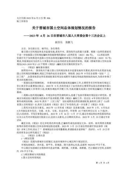 / 署名文章:2023.06.02副市长张鹏飞:关于晋城市国土空间总体规划情况的报告