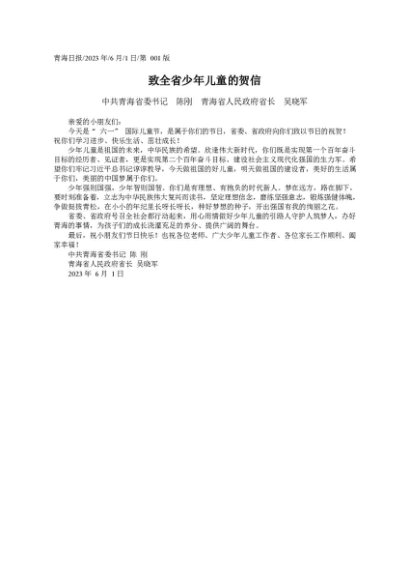 / 署名文章:2023.06.01中共青海省委书记陈刚青海省人民政府省长吴晓军:致全省少年儿童的贺信