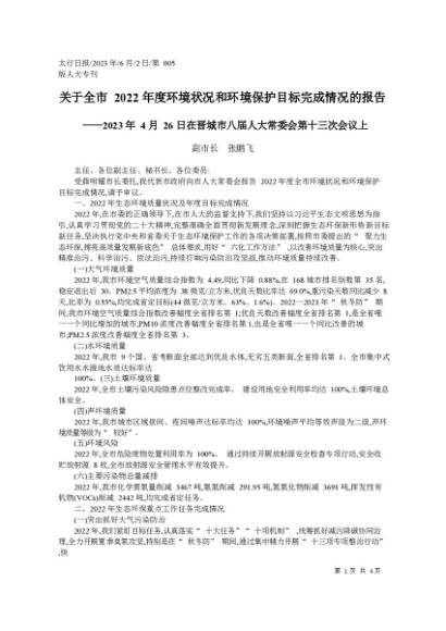 / 署名文章:2023.06.02副市长张鹏飞:关于全市2022年度环境状况和环境保护目标完成情况的报告