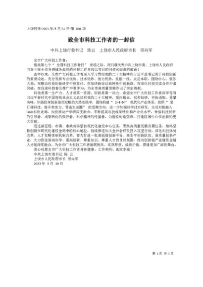 / 署名文章:2023.05.31中共上饶市委书记陈云上饶市人民政府市长邱向军:致全市科技工作者的一封信