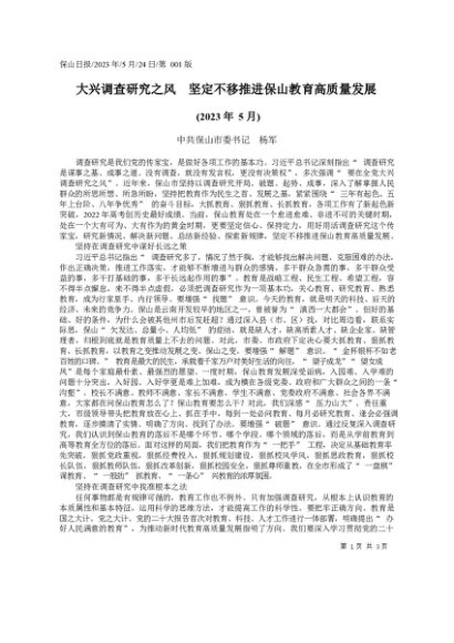 / 署名文章:2023.05.24中共保山市委书记杨军:大兴调查研究之风坚定不移推进保山教育高质量发展