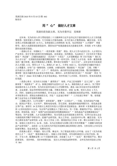 署名文章:2023.05.15芜湖市政协副主席、无为市委书记吴瑞新:用心做好人才文章
