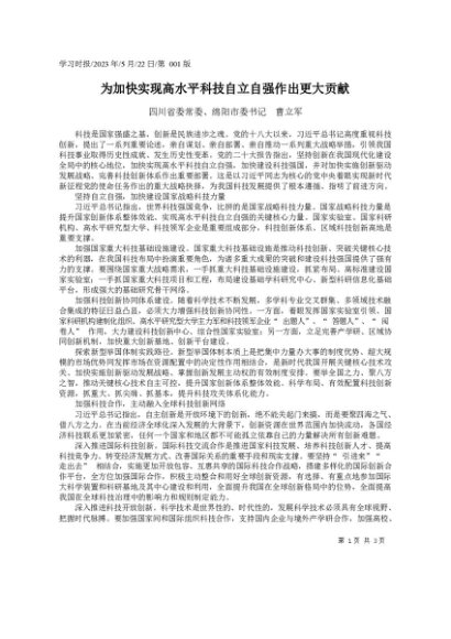 署名文章:2023.05.22四川省委常委、绵阳市委书记曹立军:为加快实现高水平科技自立自强作出更大贡献