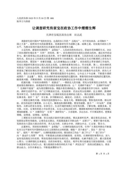 署名文章:2023.05.10天津市宝坻区政协主席田志武:让调查研究传家宝在政协工作中熠熠生辉