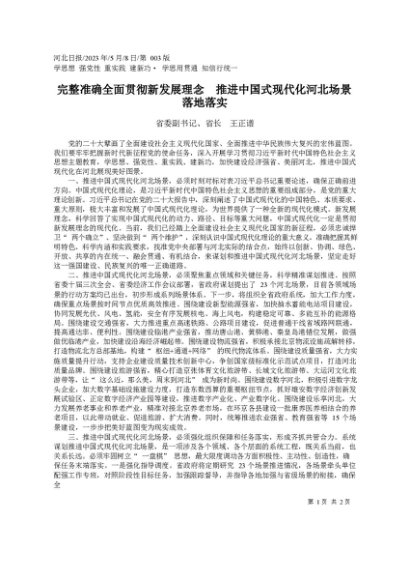 / 署名文章:2023.05.08省委副书记、省长王正谱:完整准确全面贯彻新发展理念推进中国式现代化河北场景落地落实