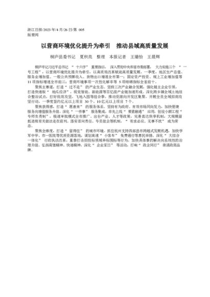 / 署名文章:2023.04.26桐庐县委书记夏积亮整理本报记者王璐怡王晨辉:以营商环境优化提升为牵引推动县域高质量发展